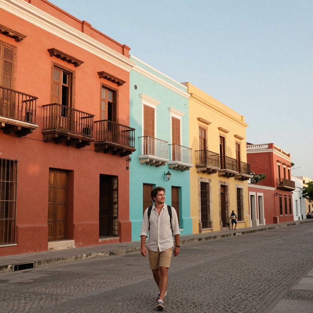 - “Tourist walking in Cartagena during dental veneer recovery trip.”