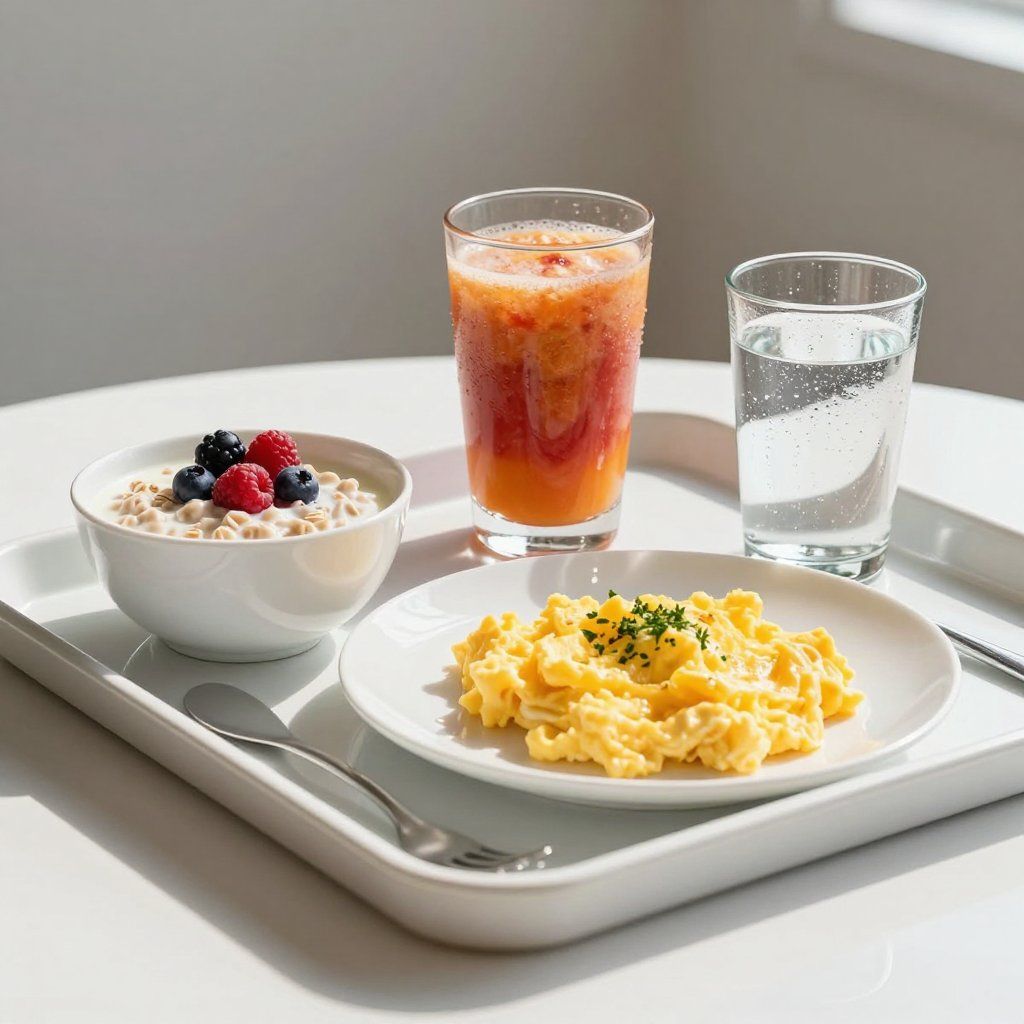 Right after treatment, prioritize foods that are soft (mashed potatoes, scrambled eggs, oatmeal, steamed vegetables, soft pasta), mild in temperature, and low in staining (water, herbal tea, clear broths, light sauces).